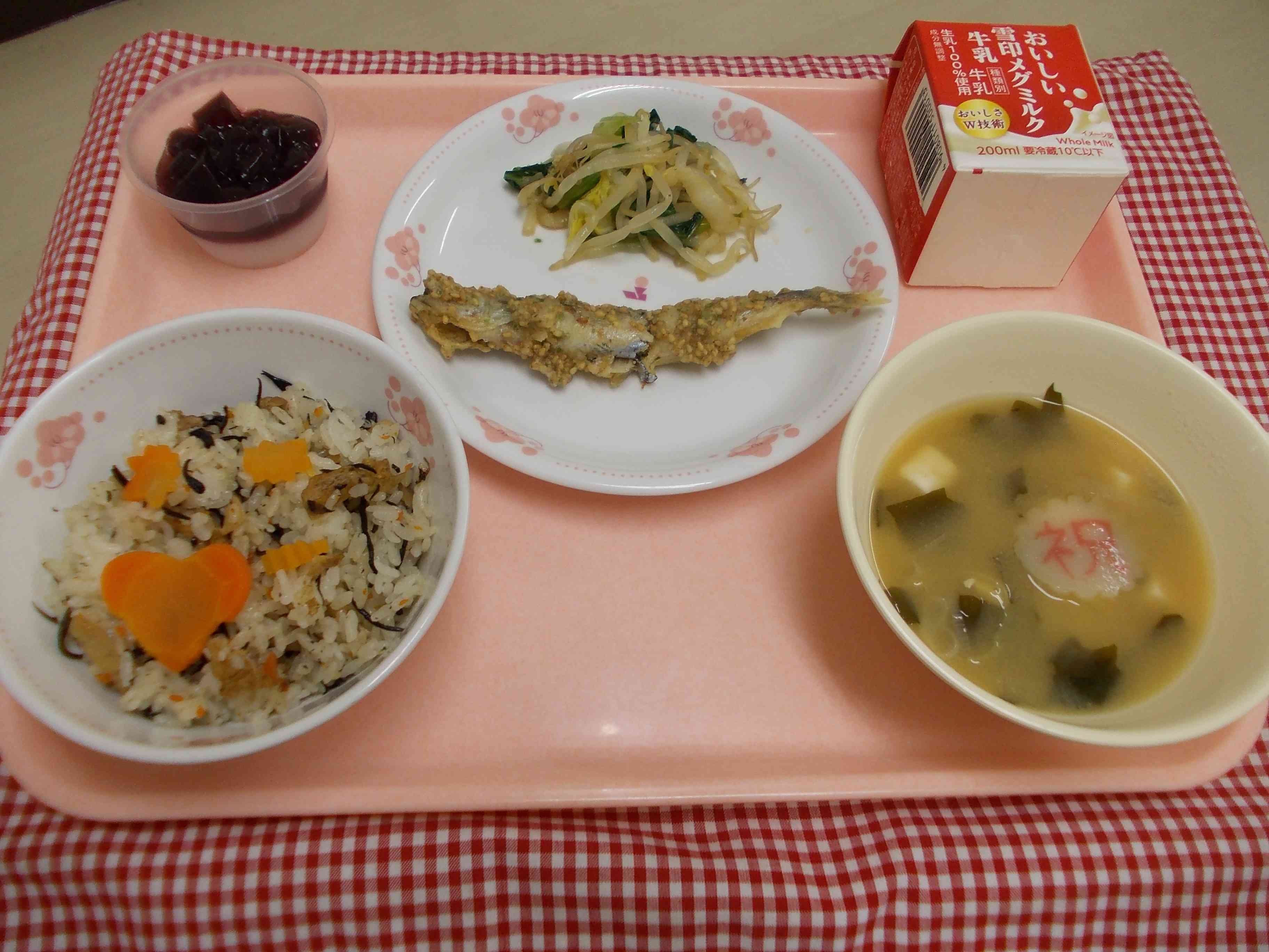 6月20日は、南砂小学校の開校記念日です。創立22周年となります。それにちなみ、今日は、「ひじきごはん・ししゃもの香味だれ・おひたし・祝いみそ汁・あじさいゼリー」でお祝い給食にしました。ひじきごはん、祝いみそ汁は、いつもの給食とひと味違うよう仕上げました。また、梅雨シーズンでもあるので、ぶどうジュースを寒天で固めて、あじさい花を作りました。 コロナ禍から日常を取り戻しつつありますが、まだまだ油断はできません。今後も安全でおいしい給食の提供と、また給食を通じて、子どもたちがコロナを乗り越えられる力を蓄えられるよう努めていきたいと思います。【添付ファイル】